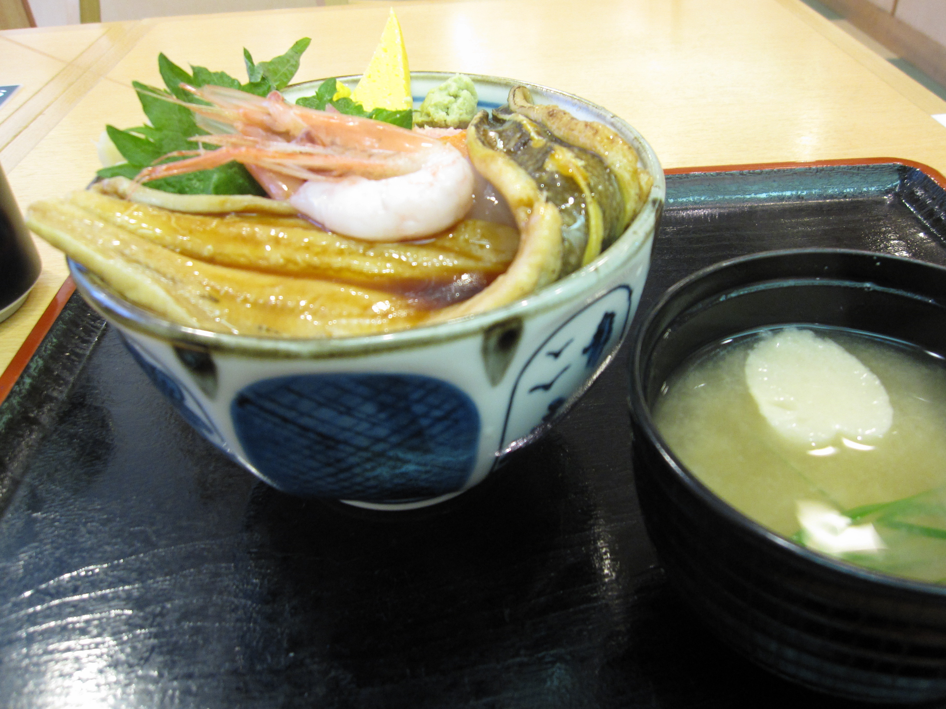 大きい穴子、そして大きなエビ・・・・・グルメ日記泣かせの海鮮丼ですね。穴子が巨大すぎて、他のネタが・・・見えないじゃん。メモしてくればよかったorz。(・・・書くつもりで行ったんだから、普通はそれくらい憶えてきますね。すいません。)よく海鮮丼に入ってるマグロもイカもタマゴ焼きも、いろいろ全部入って、おいしかったとさ(テキトー過ぎる)。