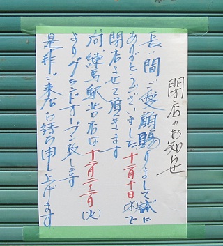 魚がし寿司、格之進(焼肉)、とりみき(居酒屋)の並びから、破顔(つけ麺)方面に行こうとすると、とりみきのシャッターが閉まってて、張り紙が。。。