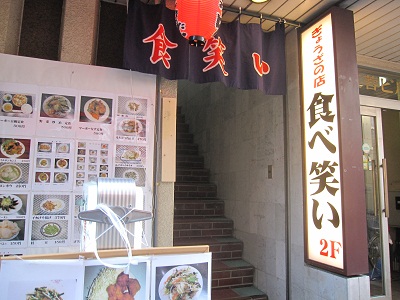 看板の屋号は、「食べ笑い」。のれんの屋号は「食笑い」。どっちでしょう?