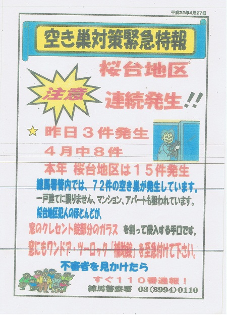 「桜台地区で空き巣被害が多発しているので注意してください。」